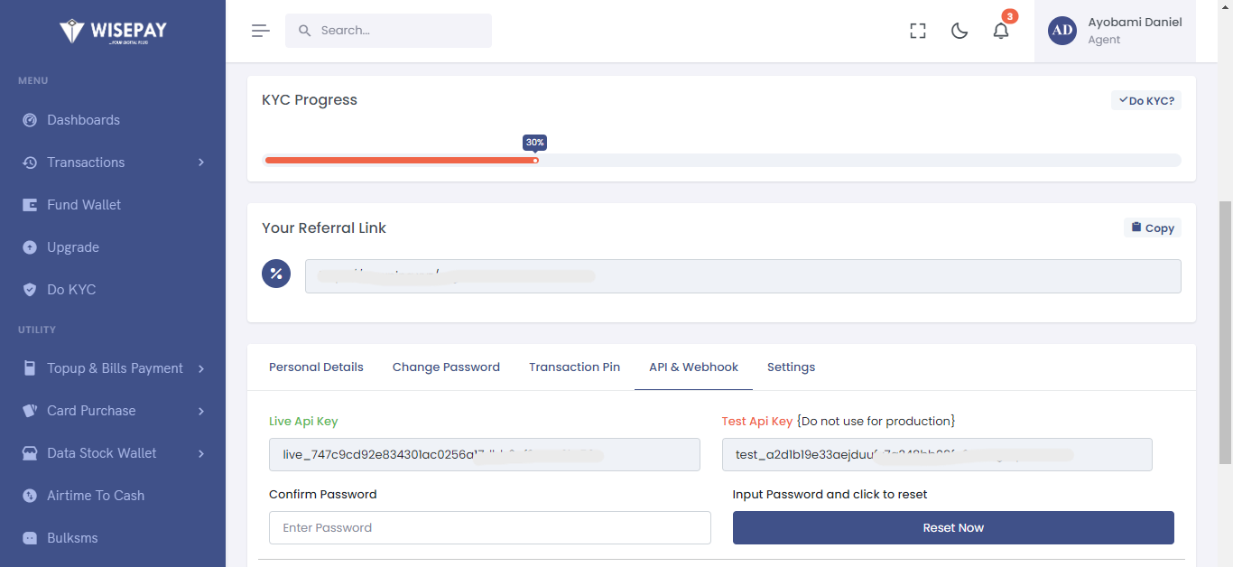 To begin using WisePay as your preferred By Now, Bill Payment solution, you must first create an account. Simply register via the our platform. When you're finished, log-on into your account, go to the account settings page, check the API & Webhook tabs, and copy your WisePay api key. We'll be needing it soon. To begin integrating WisePay as a customer, simply place your API key in the header section of your request. When you finish this process, you'll be halfway there.