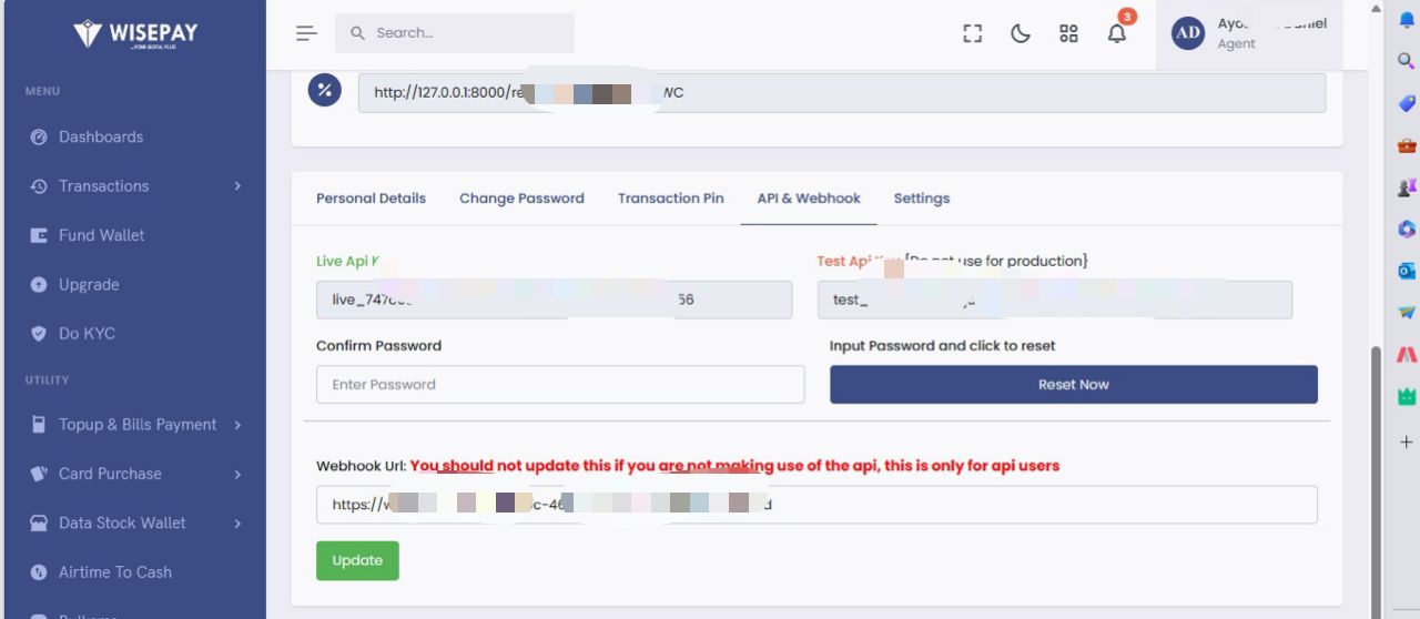 In other to take advantage of webhooks, you will have to first set up a publicly available URL that WisePay can have access to. To set up one, kindly go to your dashboard, click on the Account Settings link and check under the API & Webhook tabs, there, you will find an input box for your webhook.